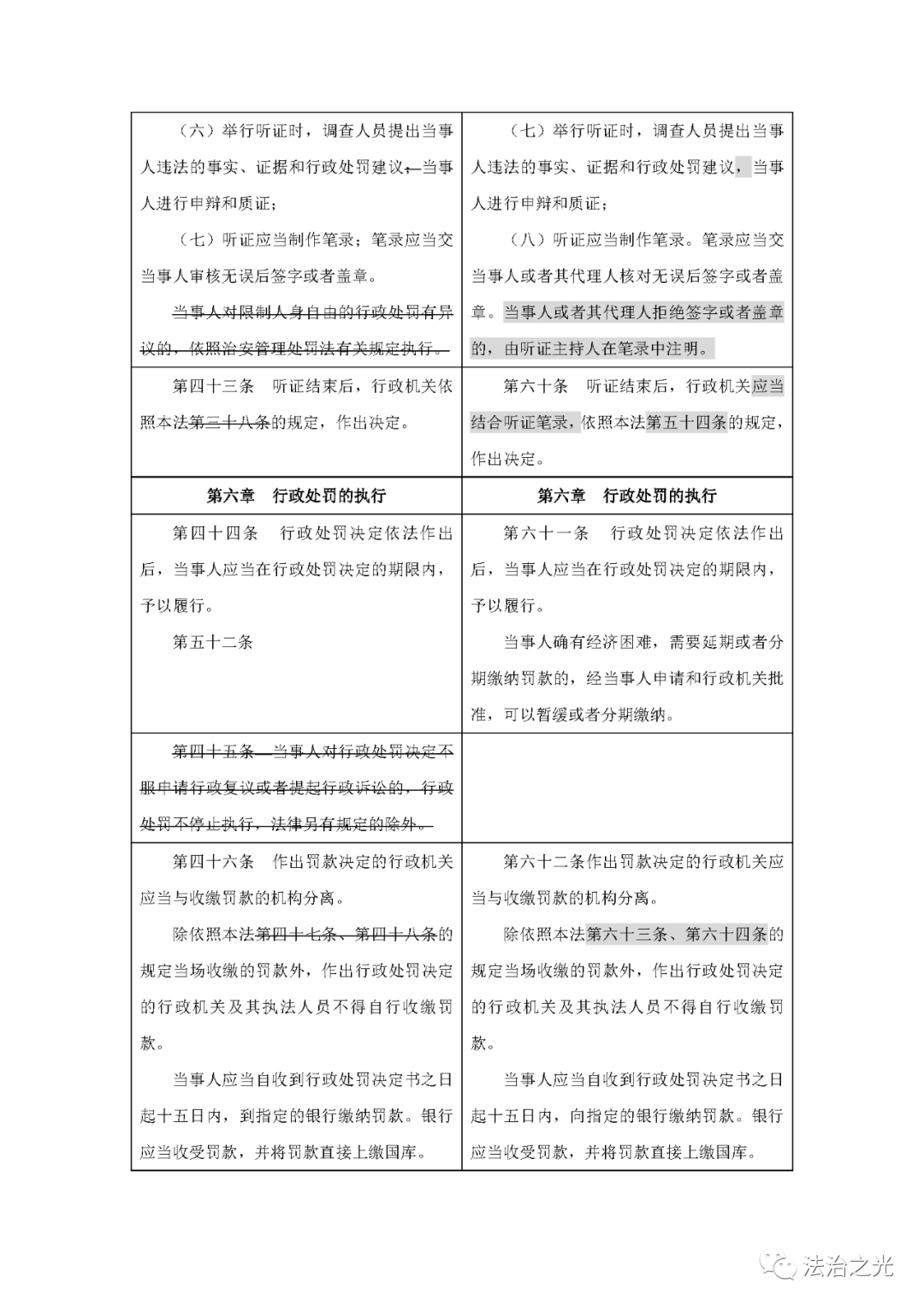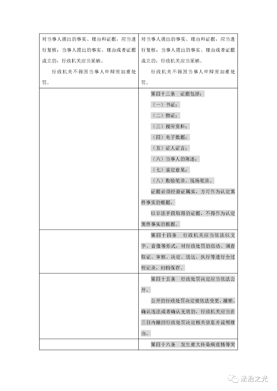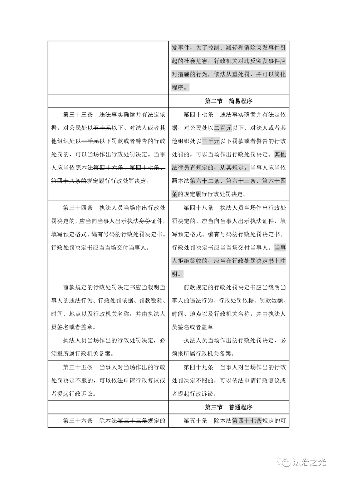 为推进严格规范公正文明执法,巩固行政执法公示制度、行政执法全过程记录制度、重大执法决定法制审核制度“三项制度”改革成果,进一步完善行政处罚程序,作以下修改:一是明确公示要求,增加规定行政处罚的实施机关、立案依据、实施程序和救济渠道等信息应当公示;行政处罚决定应当依法公开。二是体现全程记录,增加规定行政机关应当依法以文字、音像等形式,对行政处罚的启动、调查取证、审核、决定、送达、执行等进行全过程记录,归档保存。三是细化法制审核程序,列明适用情形,明确未经法制审核或者审核未通过的不得作出行政处罚决定。四是规范非现场执法,增加规定行政机关依照法律、行政法规规定利用电子技术监控设备收集、固定违法事实的,应当经过法制和技术审核,确保设置合理、标准合格、标志明显,设置地点应当向社会公布,并对记录内容和方便当事人查询作出相应规定。五是进一步完善回避制度,细化回避情形,明确对回避申请应当依法审查,但不停止调查或者实施行政处罚。六是增加规定发生重大传染病疫情等突发事件,为了控制、减轻和消除突发事件引起的社会危害,行政机关对违反突发事件应对措施的行为,依法从重处罚,并可以简化程序。七是适应行政执法实际需要,将适用简易程序的罚款数额由五十元以下和一千元以下,分别提高至二百元以下和三千元以下。八是增加立案程序,除当场作出的行政处罚外,行政机关认为符合立案标准的,应当立案。九是完善听证程序,扩大适用范围,适当延长申请期限,明确行政机关应当结合听证笔录作出决定。(修订草案第三十六条、第三十八条、第四十条、第四十四条、第四十五条第一款、第四十六条、第四十七条、第五十条第二款、第五十四条第三款、第五十八条、第五十九条、第六十条)