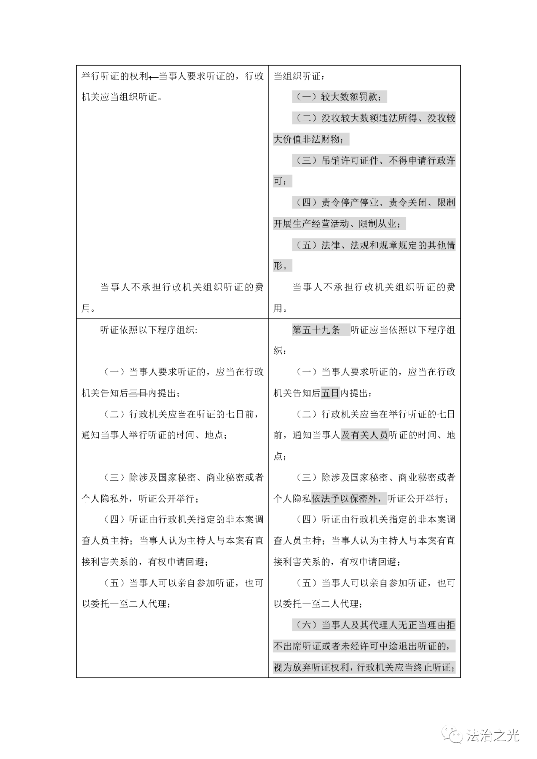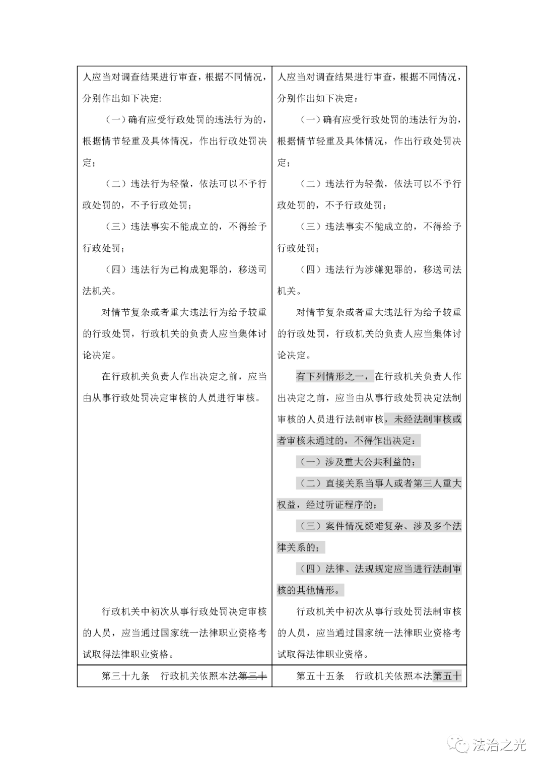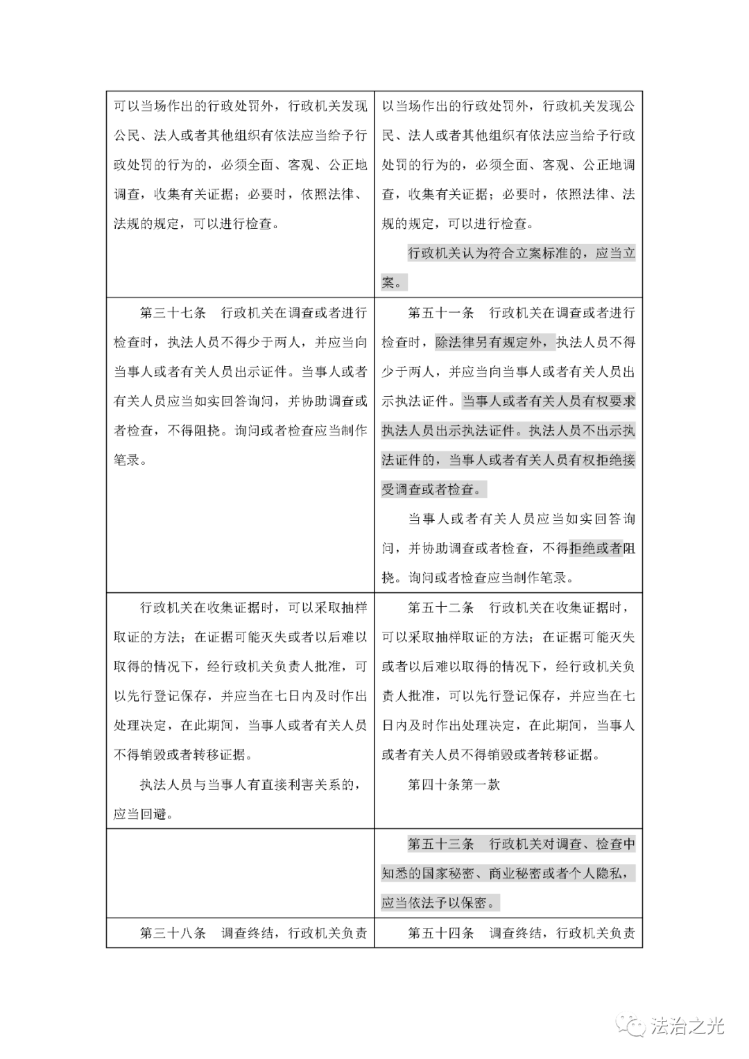 为推进严格规范公正文明执法,巩固行政执法公示制度、行政执法全过程记录制度、重大执法决定法制审核制度“三项制度”改革成果,进一步完善行政处罚程序,作以下修改:一是明确公示要求,增加规定行政处罚的实施机关、立案依据、实施程序和救济渠道等信息应当公示;行政处罚决定应当依法公开。二是体现全程记录,增加规定行政机关应当依法以文字、音像等形式,对行政处罚的启动、调查取证、审核、决定、送达、执行等进行全过程记录,归档保存。三是细化法制审核程序,列明适用情形,明确未经法制审核或者审核未通过的不得作出行政处罚决定。四是规范非现场执法,增加规定行政机关依照法律、行政法规规定利用电子技术监控设备收集、固定违法事实的,应当经过法制和技术审核,确保设置合理、标准合格、标志明显,设置地点应当向社会公布,并对记录内容和方便当事人查询作出相应规定。五是进一步完善回避制度,细化回避情形,明确对回避申请应当依法审查,但不停止调查或者实施行政处罚。六是增加规定发生重大传染病疫情等突发事件,为了控制、减轻和消除突发事件引起的社会危害,行政机关对违反突发事件应对措施的行为,依法从重处罚,并可以简化程序。七是适应行政执法实际需要,将适用简易程序的罚款数额由五十元以下和一千元以下,分别提高至二百元以下和三千元以下。八是增加立案程序,除当场作出的行政处罚外,行政机关认为符合立案标准的,应当立案。九是完善听证程序,扩大适用范围,适当延长申请期限,明确行政机关应当结合听证笔录作出决定。(修订草案第三十六条、第三十八条、第四十条、第四十四条、第四十五条第一款、第四十六条、第四十七条、第五十条第二款、第五十四条第三款、第五十八条、第五十九条、第六十条)