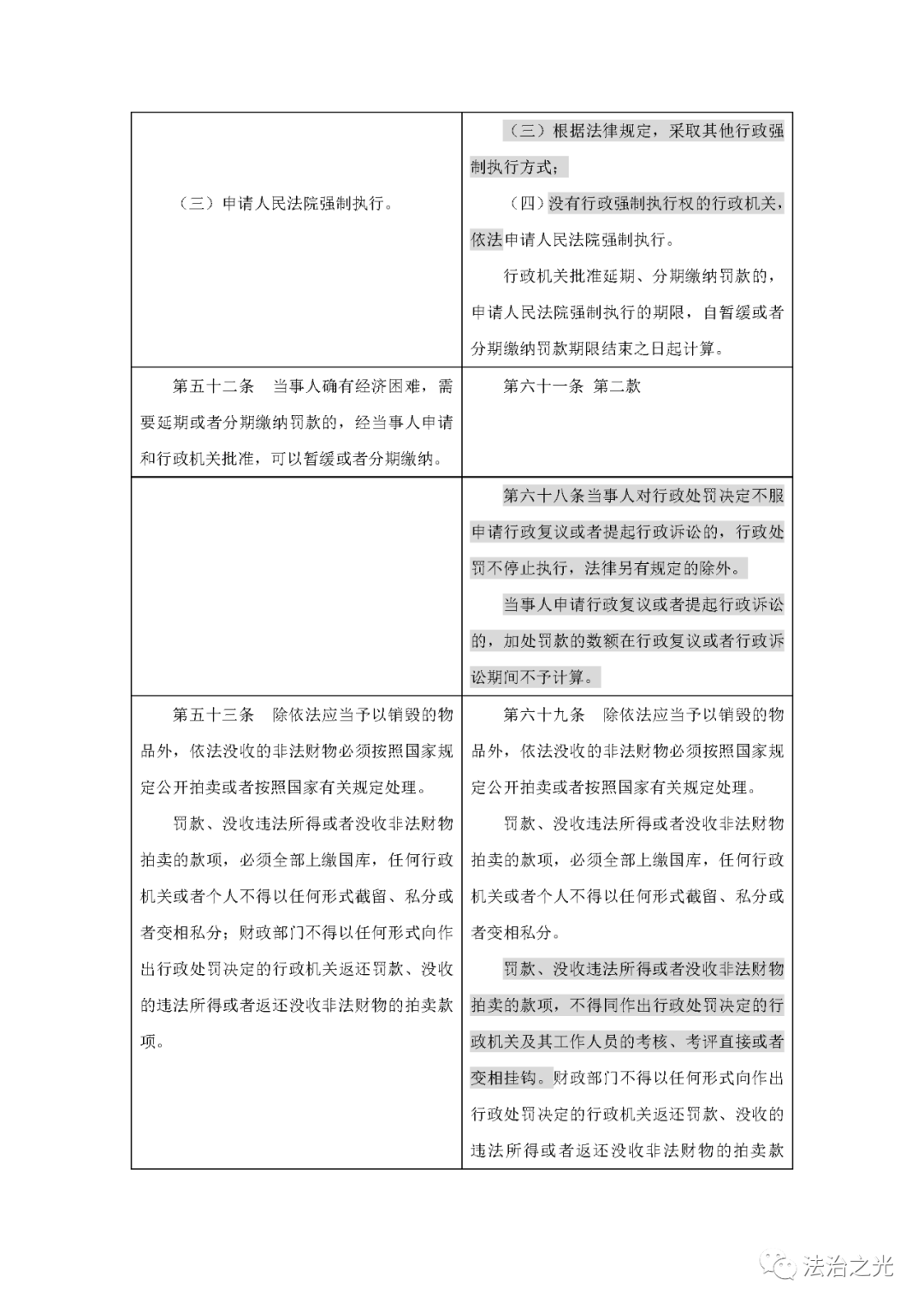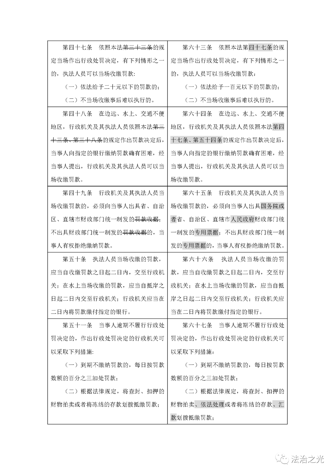 为保障行政处罚决定的依法履行,补充完善执行制度,作以下修改:一是适应行政执法实际需要,将行政机关当场收缴的罚款数额由二十元以下提高至一百元以下。二是与行政强制法相衔接,完善行政处罚的强制执行程序,规定当事人逾期不履行行政处罚决定的,行政机关可以根据法律规定实施行政强制执行。三是明确行政机关批准延期、分期缴纳罚款的,申请人民法院强制执行的期限,自暂缓或者分期缴纳罚款期限结束之日起计算。四是明确当事人申请行政复议或者提起行政诉讼的,加处罚款的数额在行政复议或者行政诉讼期间不予计算。(修订草案第六十三条、第六十七条、第六十八条第二款)
